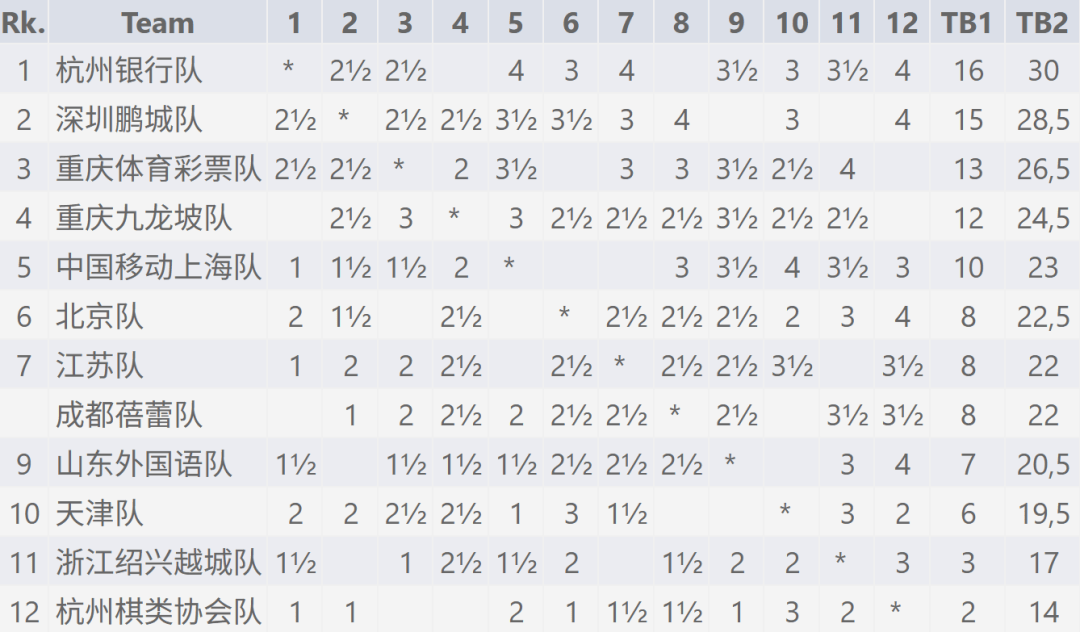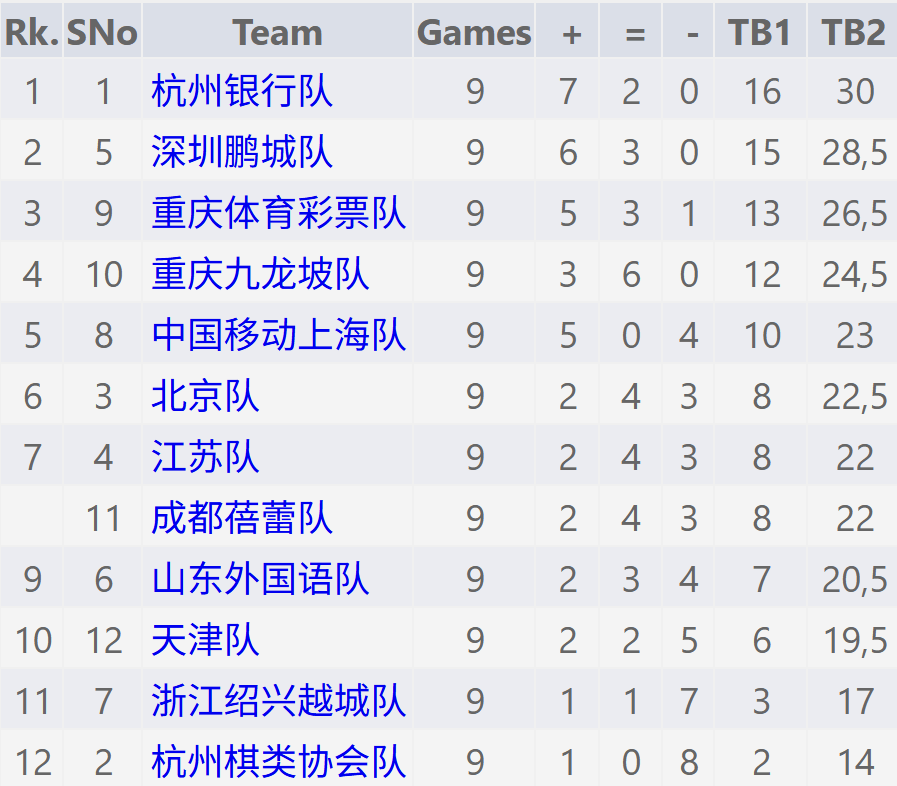 九轮过后,杭州银行队七胜两平场分16分,继续领先。深圳鹏城队六胜三平场分15分,紧追不舍。重庆体育彩票队五胜三平一负场分13分,排名第三。重庆九龙坡队四胜五平场分12分,位列第四。之后分别是中国移动上海队、北京队、江苏队、成都蓓蕾队、山东外国语队、天津队、浙江绍兴越城队和杭州棋类协会队。返回搜狐,查看更多
