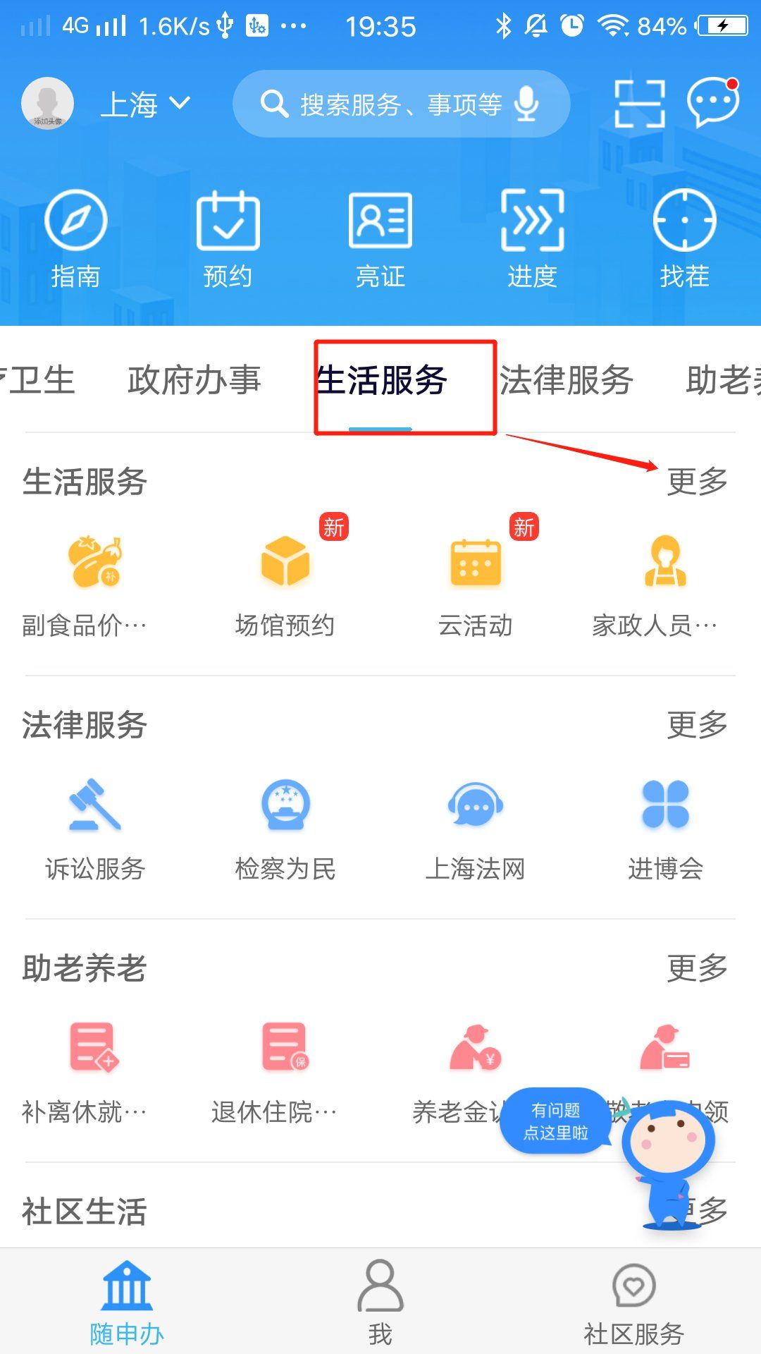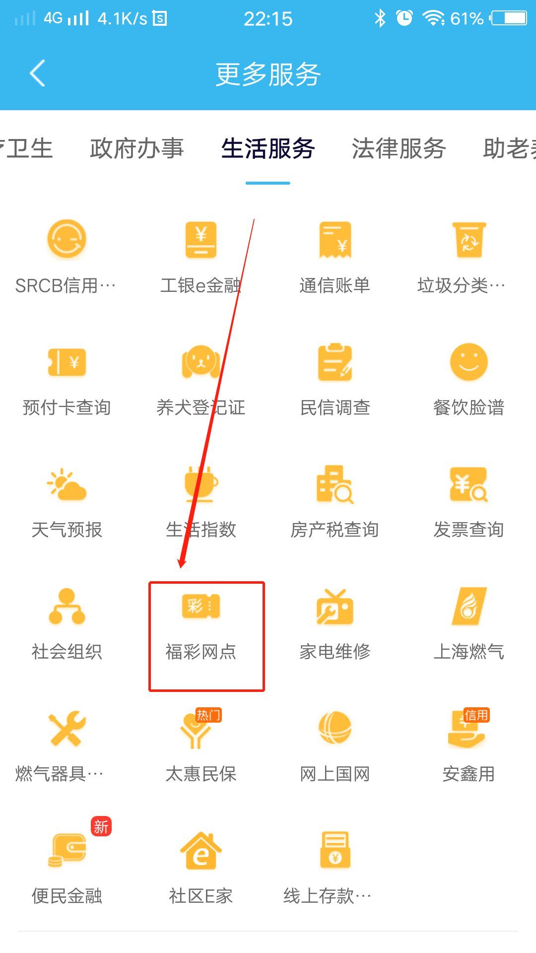 第二步:在下方菜单栏找到“随申办”,然后找到“生活服务”-“福彩网点”,然后点击进入下一步(如下图所示);