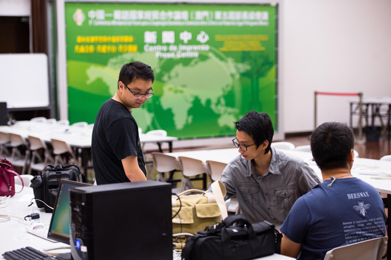 10月9日,记者在新闻中心工作。当日,中国-葡语国家经贸合作论坛第五届部长级会议新闻中心正式启用。中葡论坛将于10月11日至12日举行。新华社记者 张金加 摄