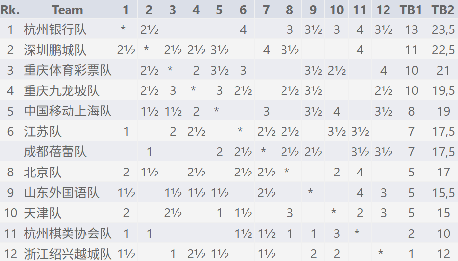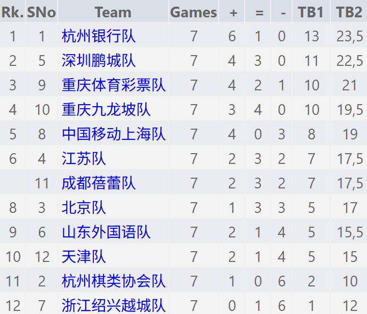 七轮过后,杭州银行队六胜一平场分13分继续领跑。深圳鹏城队四胜三平场分11分,升至第二。重庆体育彩票队和重庆九龙坡队场分同积10分,位列第三和第四。之后分别是中国移动上海队、江苏队、成都蓓蕾队、北京队、山东外国语队、天津队、杭州棋类协会队和浙江绍兴越城队。返回搜狐,查看更多