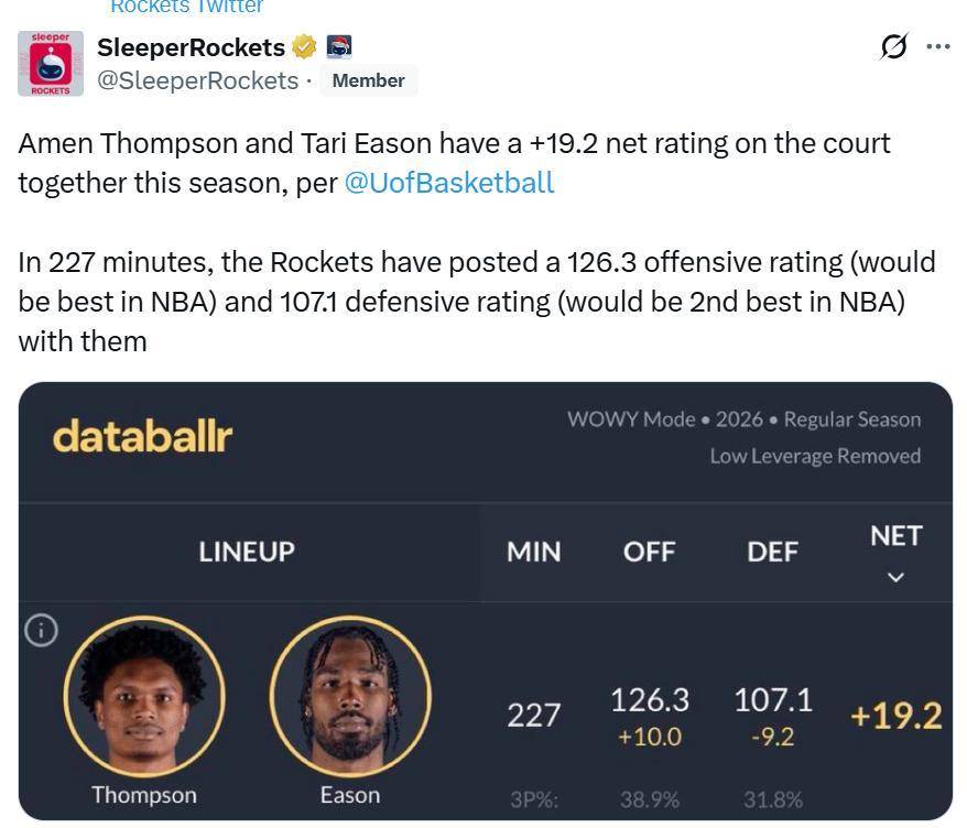 数据显示,在本赛季伊森首发的五场比赛中,火箭队全部取胜。而当伊森与阿门同时在场时,球队的进攻效率飙升至126.3,高居联盟首位;防守效率达到107.1,位列第二;净效率更是高达19.2,表现极其耀眼。