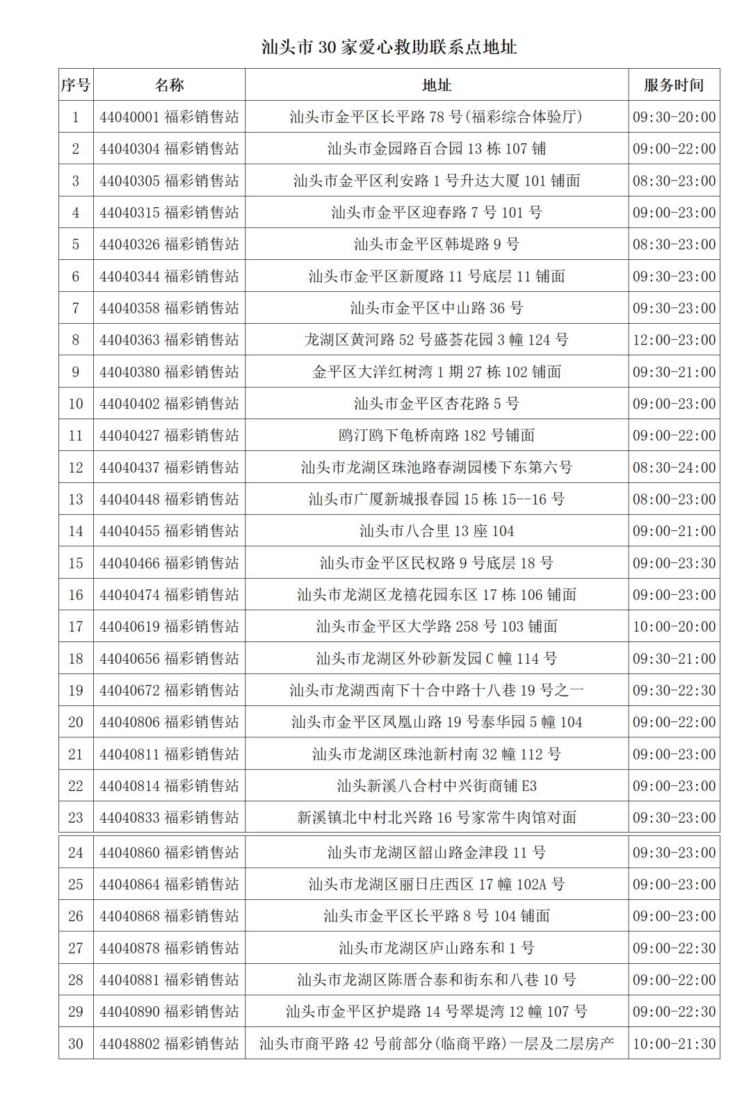 此外,我市还在金平区、龙湖区30家福彩销售点设立爱心救助联系点,在日常营业时间内,免费为有需要帮助的流浪乞讨等临时遇困人员提供提供救助咨询、救助引导、转介救助等便民服务。
