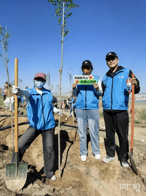 活动现场,新疆体彩中心的干部职工们身着统一服装,精神饱满、干劲十足,挥锹挖坑、扶苗填土、踩实浇水,每一道工序都一丝不苟,现场一派热火朝天的劳动景象。